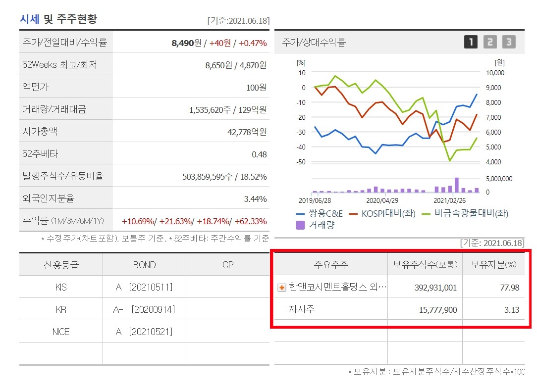 쌍용C&E는 동종업계 시장점유율 1위 회사로 배당도 넘칠만큼 잘 챙겨주기 때문에 시장에서 고평가 받는 주식이라고 생각해요.