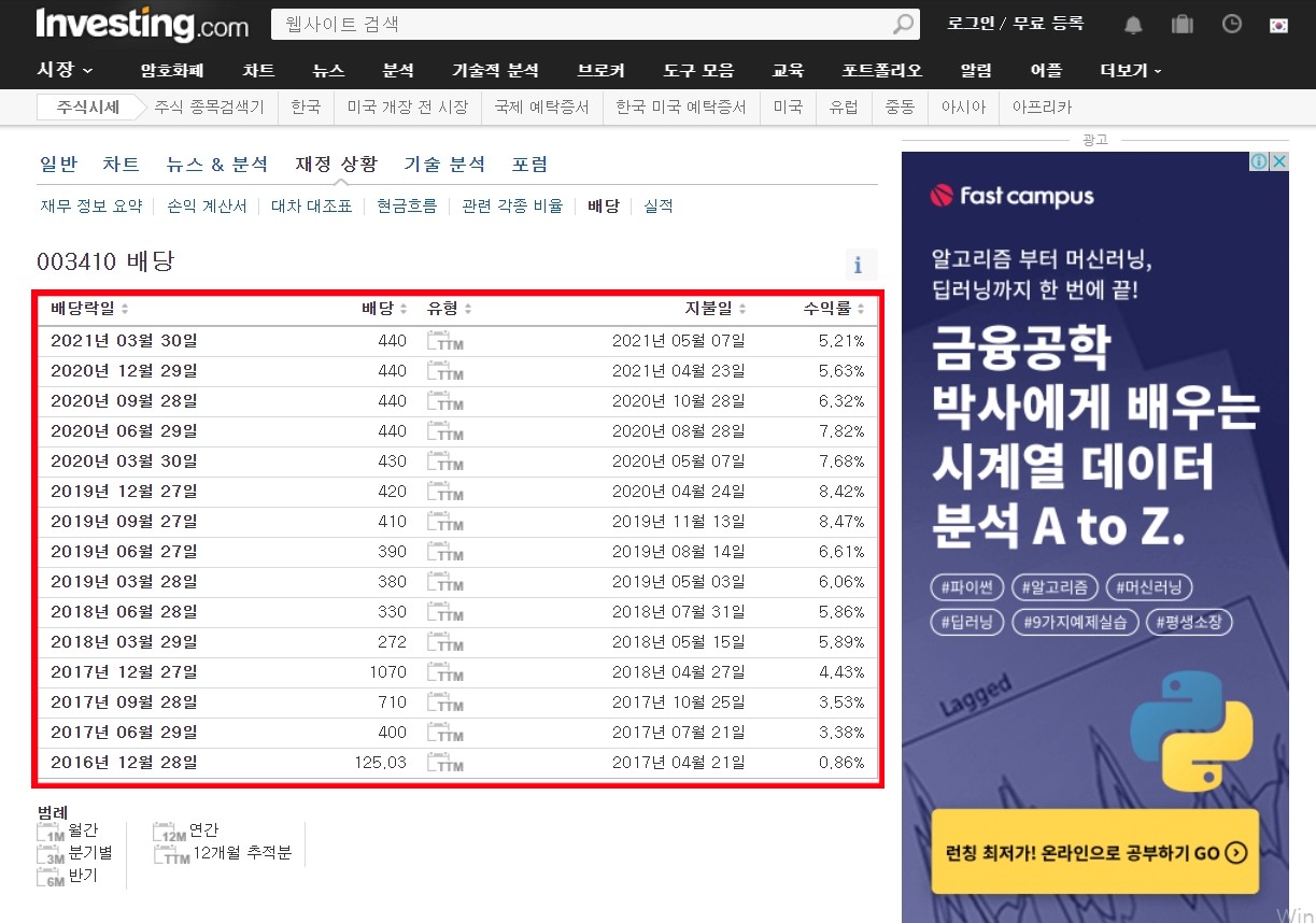 과거 배당기준일과 배당락일은 인베스팅닷컴을 참고하시면 되고요.