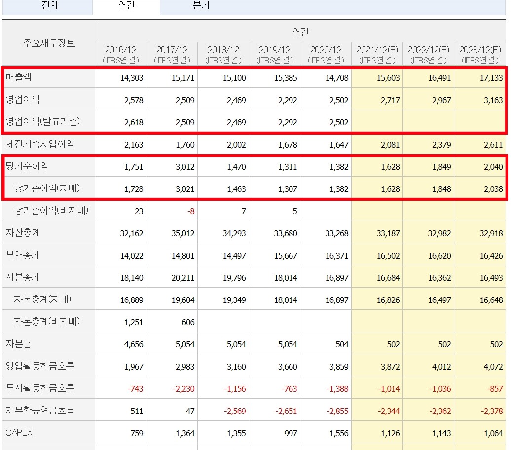 영업이익 및 당기순이익도 지난5년간 박스권에 갇혀 있다는 것을 확인할 수 있고요.