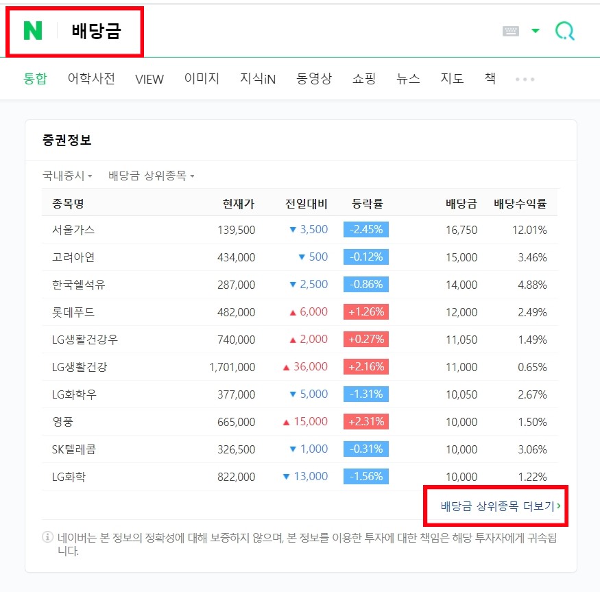 [네이버]에 [배당금]이라고 검색하면 자동적으로 고배당주를 보여줍니다.
