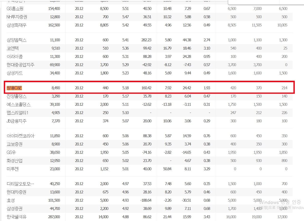 쌍용C&E는 대표 배당주로서 역시나 상위에 랭크되어 있습니다.