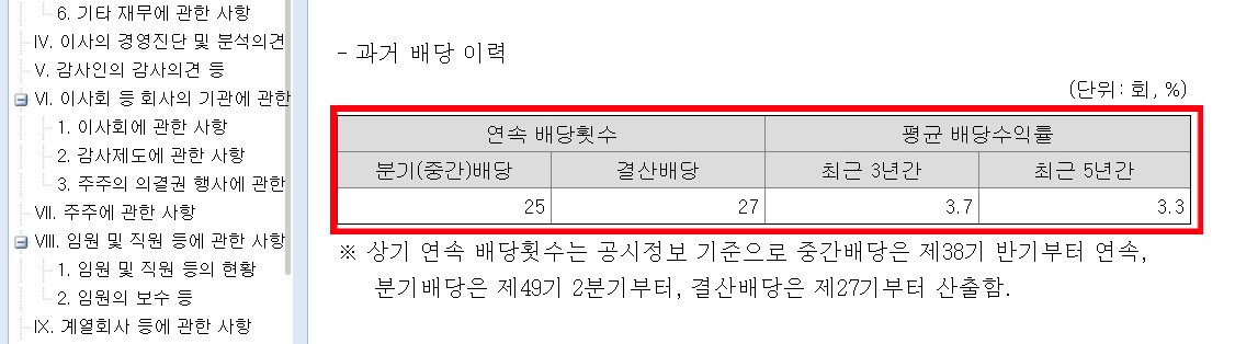 분기배당 연속 25회 / 결산배당은 연속 27회 배당 지급하고 있네요.