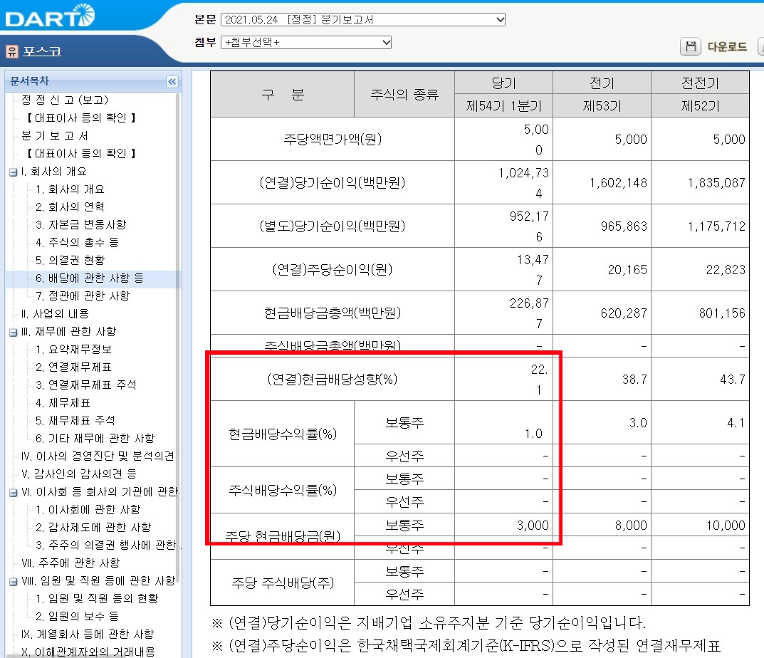 포스코 2021년 1분기기준, 분기배당금은 3,000원 / (연결)현금배당성향은 22.1% 다소 낮은 수준인데 YOY 순이익 174% 상승으로 배당금 규모는 YOY 2배 상승했습니다.