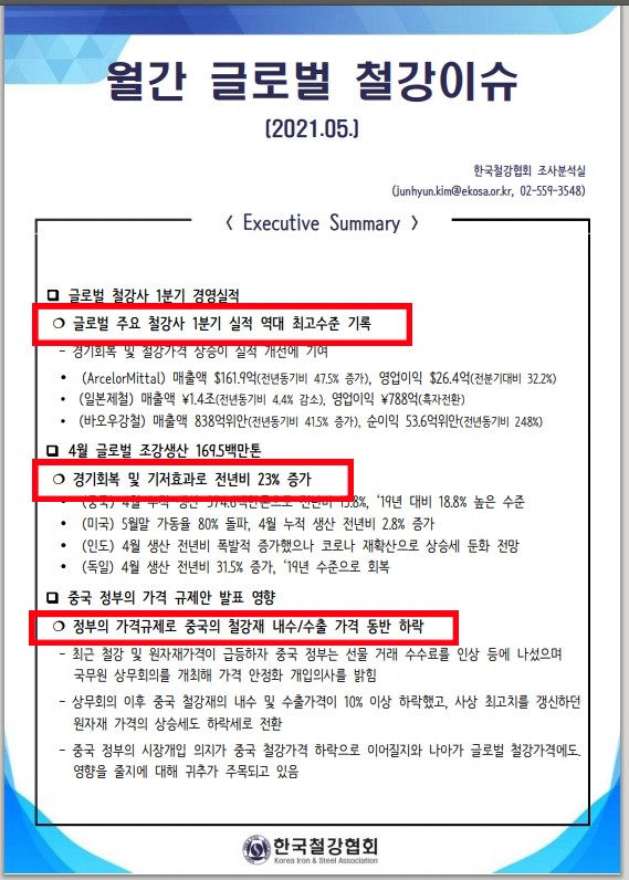 실제 관련 기사를 찾아보면 철근 등의 제품 가격 상승으로 주요 수요 산업인 건설업은 오히려 '고'원가 압박을 받고 있다고 합니다.
