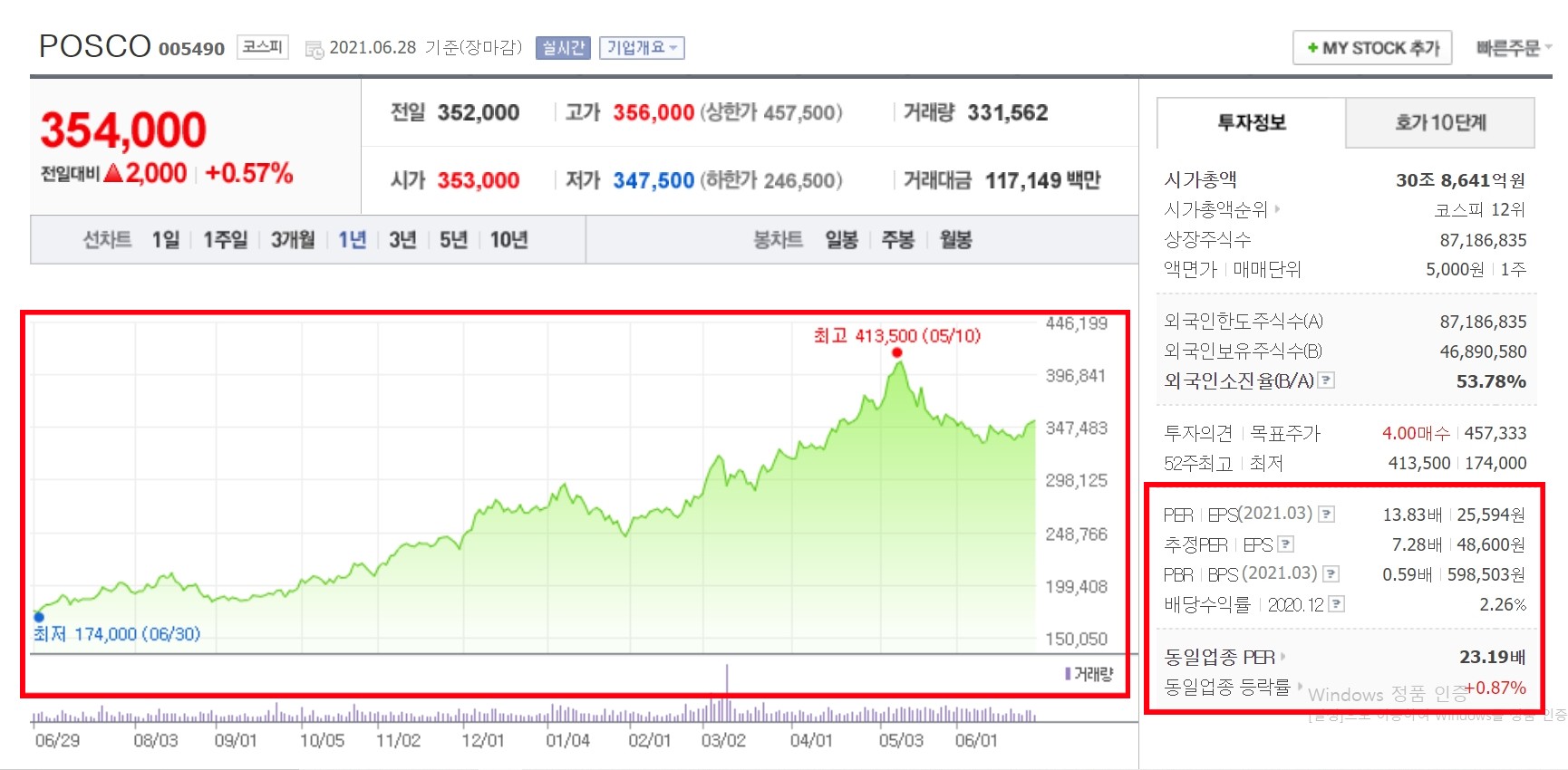 인플레이션 시대가 도래했고 경기상승사이클의 초입에 있는 현재의 시점에서 POSCO PER는 13.83배, 배당수익률은 2.26%입니다.